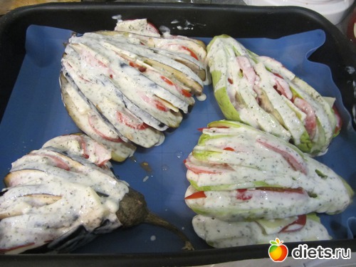 Выкладываем баклажаны и кабачки на противень, застеленный силиконовым ковриком