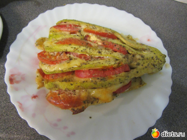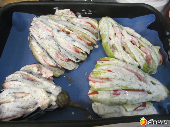 Баклажан натереть солью, оставить на мин 15 затем залить холодной водой и дать постоять еще мин.15-20. Хорошо вытереть. Баклажан т кабачки, разрезать вдоль на полоски не дорезая до конца. Сыр нарезать на пластины, помидоры порезать полукольцами.