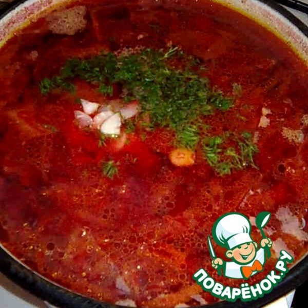 7. 7 Готовый борщ посыпать рубленым укропом и чесноком.