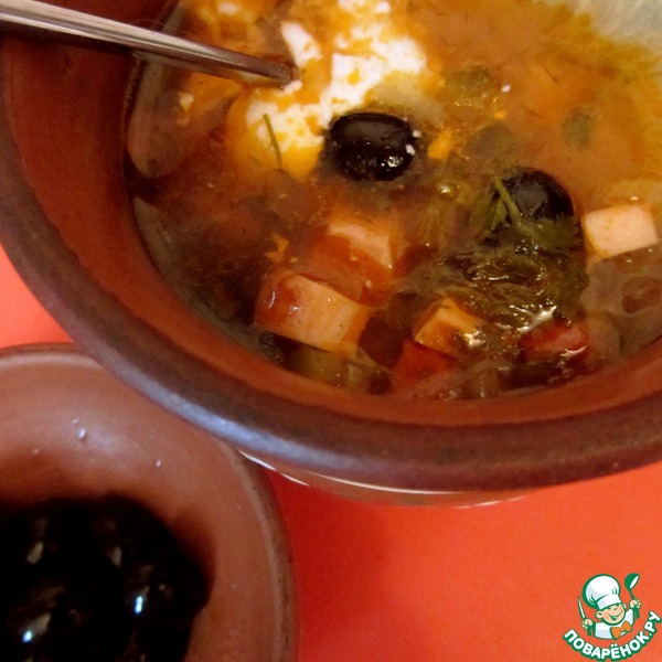 10. Этот шаг - по желанию. Разлить солянку по горшочкам и потомить в духовке (до закипания). Перед подачей в каждый горшочек (или в тарелку) положить сметану, несколько черных маслин и ломтик лимона. К слову сказать, муж мой ест почему-то без сметаны...