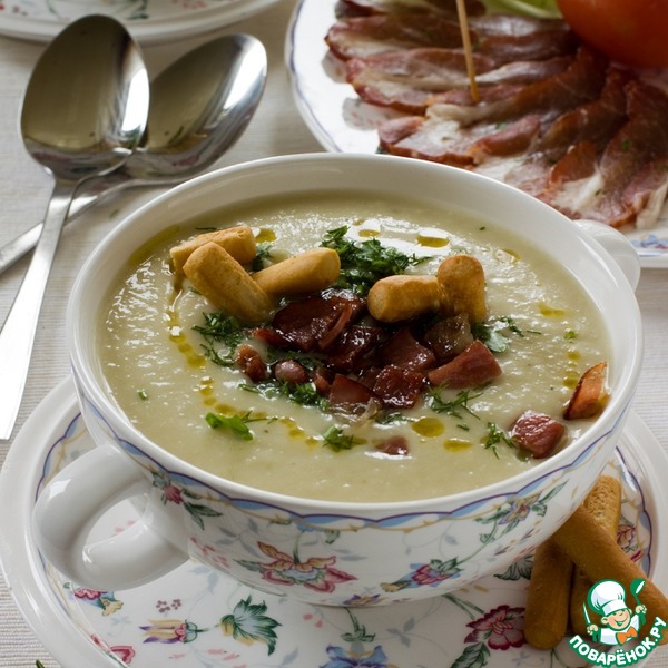 7. Разбавьте бульоном (водой) до нужной густоты. При подаче посыпать зеленью, сухариками и поджаренным беконом, ветчиной или кусочками отварного куриного мяса.