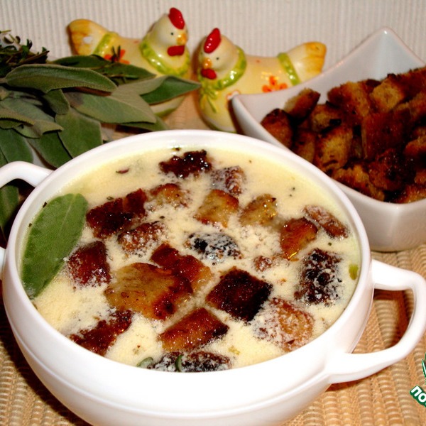 5. Суп разлить по тарелкам и подавать горячим с гренками и свежей зеленью. Любители супа погуще, добавьте больше желтков.
