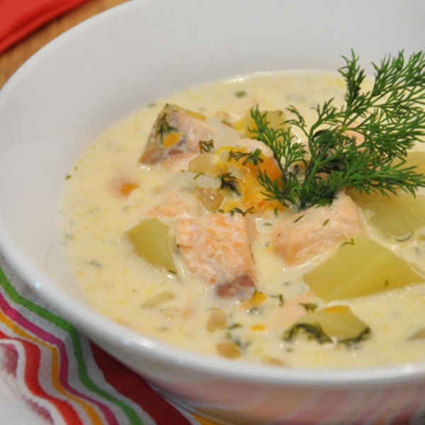 4. Закладываем пассерованные овощи в кастрюлю, добавляем туда же нарезанное кубиками филе рыбы, посолить, поперчить, дать супу закипеть, поварить минут пять (до готовности рыбы), добавить мелко нарезанный укроп, выключить огонь, дать супу настояться минут пять и разливать по тарелкам.