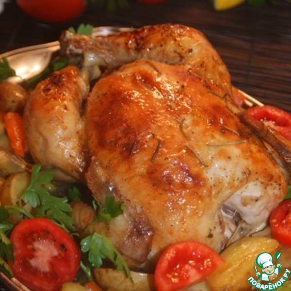 10. Сервировать курицу вместе с запечеными и свежими овощами и зеленью, во время еды мясо поливать лимонным соком.
