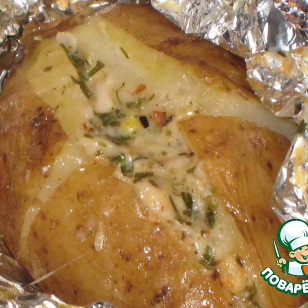 На серединку фольги положить одну картофелину, в разрез выложить чайную ложку начинки