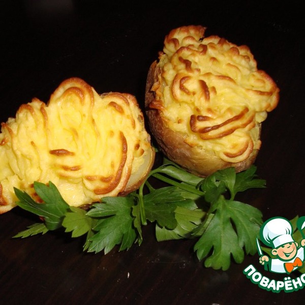 5. Теперь снова заполняем половинки картофельным тестом. Немного можно оставить и нанести сверху с помощью кондитерского шприца рисунок. Или выкладывайте с горкой и наносите узор с помощью вилки. Ставим в разогретую до 250 гр духовку. Запекаем до золотистого цвета (чтобы вид был более красивый, можно сверху смазать яйцом).