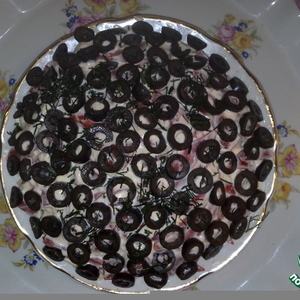 10. На помидоры выкладываем кружочки маслинок. Хорошо бы украсить зеленью, но у меня к сожалению не нашлось, только немножко укропа.