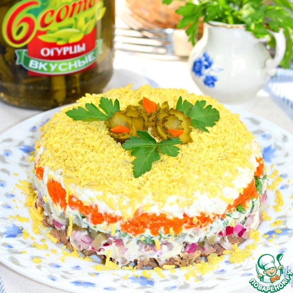 Собирая салат таким образом, каждый слой стоит чуть придавливать, утрамбовывать, чтобы салат хорошо держал форму и быстрее пропитался.
