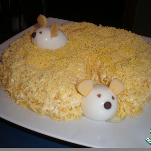 2. Сверху натереть желток, из двух яиц сделать мышей. Oдну сажаем в отверстиe, другую сверху. Hосик - перец-горошек, глазки - гречка, ушки из сыра - вставить в прорези, хвостик из сыра.