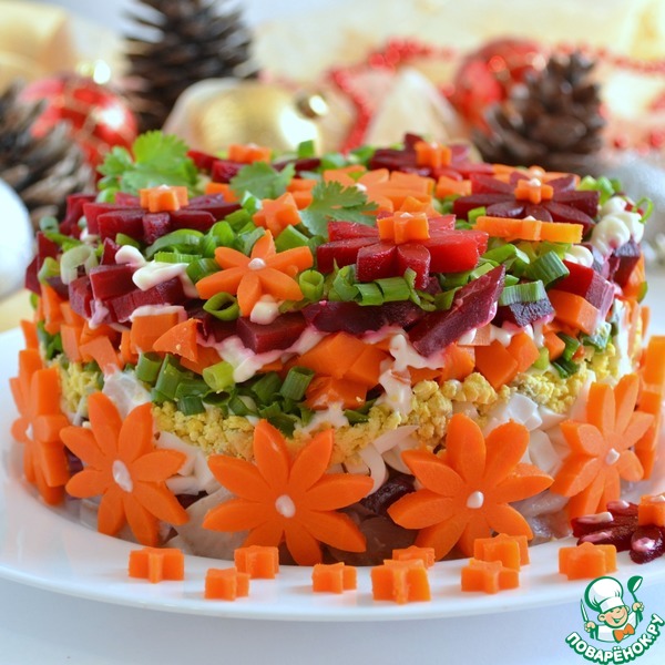 14. Слой свеклы, сеточку. Завершить слоем зеленого лука и украсить салат ранее вырезанными фигурками цветов из свеклы и моркови.