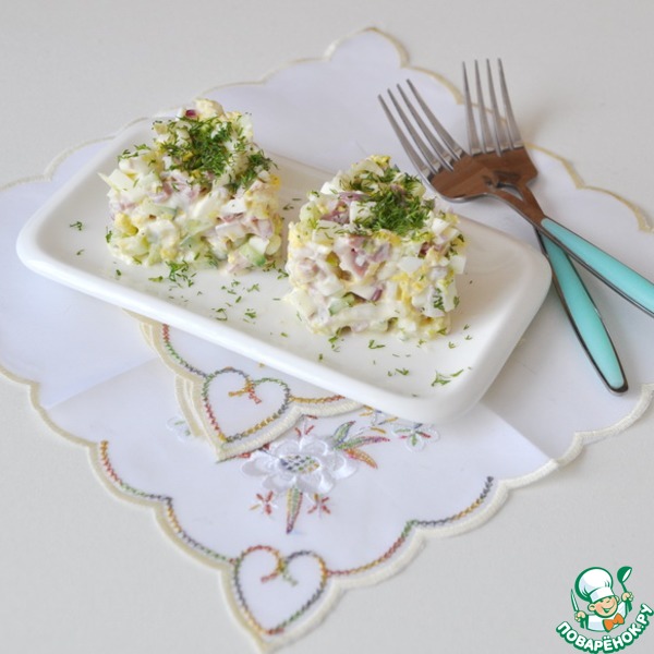 6. Всё перемешиваем, охлаждаем. Подаём в общем салатнике или порционно, посыпав мелко рубленной зеленью укропа.