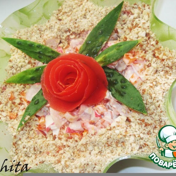 6. Куриное филе, крабовые палочки, помидор, перец, чеснок смешать, посолить и заправить майонезом.