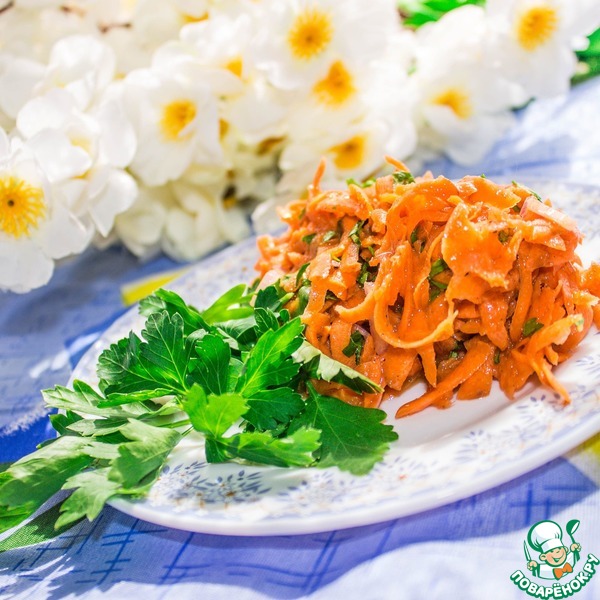 3. К моркови добавляем порубленные петрушку и лук. Вливаем соус и хорошенько перемешиваем. Если у Вас морковь не слишком сочная, рекомендую увеличить количество ингредиентов для соуса.