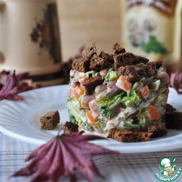 Сверху посыпаем салат ржаными сухариками.