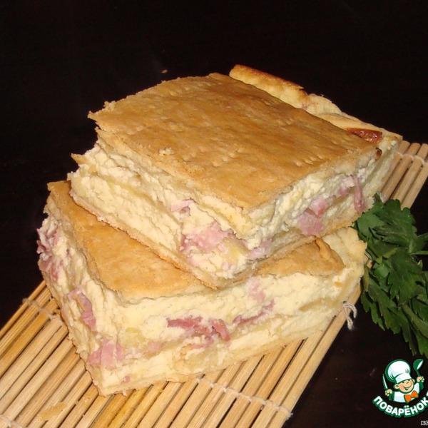 5. Раскатываем маленький кусок теста, выкладываем на начинку (на этом этапе муж попросил добавить ветчины в пирог, вы можете сделать то же самое. Это также может быть фарш, обжаренный с луком, резаные помидоры или болгарский перец или зелень петрушки). Заливаем оставшейся начинкой.