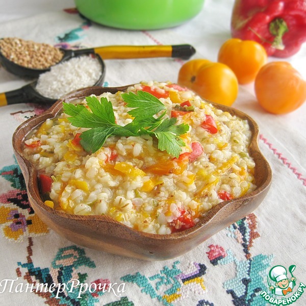 3. В большую кастрюлю выложить ингредиенты в следующей последовательности: рис - перец - гречка - морковь - перловка - помидоры. Посолить и добавить нарезанную зелень.