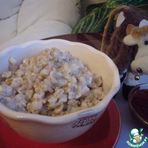 6. Залить перловку сливками, посолить, добавить сахар, хорошо перемешать.