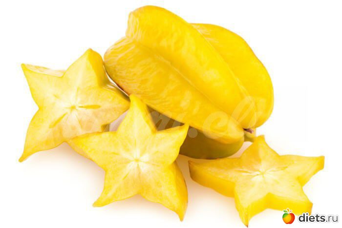 Карамбола - плод величиной от куриного яйца до апельсина. Плоды в зрелости могут быть от янтарно-желтого до золотисто-желтого цвета и похожи на ребристый дирижабль, так как имеют массивные ребристые наросты. При поперечном срезе фрукт напоминает звезду. Плоды мясистые, сочные и слегка пряные, с кисло-сладким либо сладким вкусом. По вкусу одновременно они могут напоминать сливу с яблоком и виноградом либо крыжовник со сливовым ароматом. Кожица также съедобна.