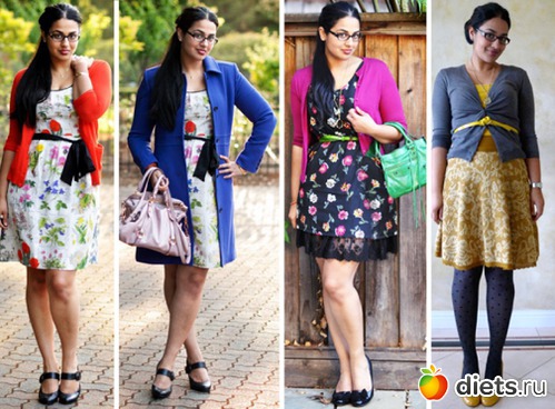 Фасоны максимально стройнящие - удлиненные кардиганы с платьями "за колено" и сапожками.