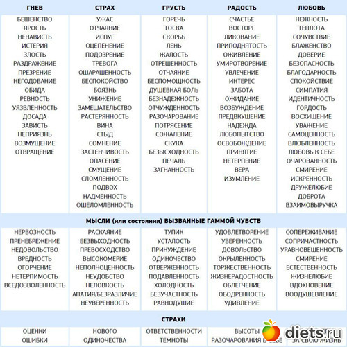 И дополнительно прикреплю здесь табличку с чувствами и эмоциями, чтобы их было легче обнаруживать.