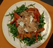 На тарелку выложить салат, сверху запечёный перец, потом творожный крем и рыбу...