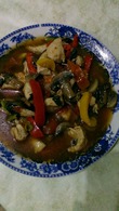 Куриную грудку замориновать в соевом соусе(у меня молосоленый без сахара), затем, потушила без масла, но немного добавила в сковородку водички, через минут 10 добавила резанные шампиньоны, ещё через минут 10, перец,