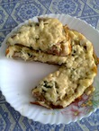 Нагреть антипригарную сковороду и влить белок. ЖАРИТЬ ДО подрумянивания, затем перевернуть. Готовый омлет выложить на тарелку( доску),