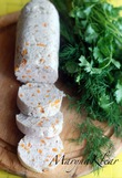 Правильнее будет назвать сей продукт не колбасой, а куриным рубленым рулетом. Пакет из-под сока для формовки, как предлагалось в рецепте, заменила обычной емкостью для ланча, выстелив ее целлофаном. Вес рулета точно не скажу, но известны параметры: квадрат со сторонами 10 см и высотой 6 см. Надо сказать, что блюдо стоит потраченного времени (помним, что я не люблю готовку, а она не любит меня)...