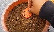 Засыпаем, почти доверху, подготовленным грунтом емкость, в которую Вы будете сажать помидоры, а сверху выкладываем кружочки из помидор...