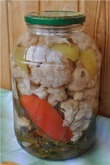 Помидоры и перец (сладкий и горький) перекрутить на мясорубке. Добавить сахар, соль, пост. масло, уксус. Довести до кипения и кладем соцветия капусты. Варить на легком огне 15 мин. Складываем в банки и закатываем.