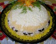 2 слой: яйца, натертые на терке и смешанные с майонезом (два желтка отложить для украшения);
