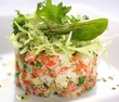 Приготовление: Отвари и почисти картофель и яйца. Нарежь кубиками огурцы, лук, яйца и картофель. Выложи все в миску. Филе семги нарежь небольшими кубиками...