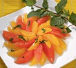 Из одного апельсина выжать сок. Оставшиеся апельсины и грейпфруты очистить, острым ножом вырезать мякоть из пленок. Выложить на круглое блюдо рядами.