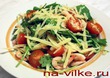 На блюдо выложить листья салата Руколла, добавить креветки с маслом и нарезанные половинками помидоры черри...