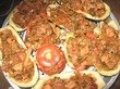 Рецепт такой :Разрезаем баклажаны пополам и ложкой вырезаем мякоть, режем мелко. Сладкий перец разрезаем пополам и выбираем семена и у помидора выбираем серединку.