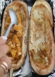 1. Баклажан разрезать пополам и достать мякоть ложкой, не выбрасывать. Посолить, смазать их маслом и отправить в духовку при 180 гр. на 15-20 мин.