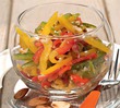 Приготовить заправку. Чеснок очистить и измельчить. Миндаль и оливки порубить ножом или измельчить в блендере в мелкую крошку, поместить в миску. Добавить чеснок и оливковое масло, тщательно перемешать. Перцы вымыть и нарезать тонкой соломкой, удалив сердцевину...