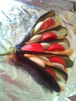 В разрезы вкладываем дольки огурца, помидора, репчатого лука и полосочки сыра. Фольгу слегка смазываем растительным маслом, заворачиваем в нее "хвост" и запекаем в духовке 15-20 минут.