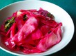 Для приготовления кочан капусты нарезать толстой соломкой или брусочками. Свеклу очистить и нарезать тонкими брусочками. Соединить овощи и перемешать. Дополнить нарезанной зеленью сельдерея и несколькими кусочками острого перца (по вкусу). Посолить.
