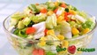 Добавить горошек, заправить йогуртом, добавив раздавленный зубчик чеснока.