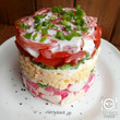 Можно этот салат делать не слоями, а перемешать! Йогурт смешать с чесноком, палочки и помидор порезать кубиками, сыр на терке, зелень порубить! Все перемешать или выложить слоями!