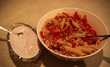 500 г пенне (сорт макарон), 10-15 черных оливок, 2 веточки тимьяна, 1 зубок чеснока, 250 г натурального йогурта, 3 ст.л. белого винного уксуса, соль, молотый перец, 1 щепотка сахара, 1 банка консервированного тунца в собственном соку (125 г), 120 г грецких орехов, 2 красных перца.