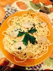 У меня как обычно, быстрые, но оч вкусные блюда. Рекомендую! Нарезать Буженину Имперскую запеченную РЕМИТ небольшими тонкими слайсами (по желанию любой формы), обжарить на сковороде с добавлением небольшого количества растительного масла и раздавленного ножом чеснока до легкой золотистой корочки. Добавить сливки, слегка прогреть на небольшом огне. Добавить заранее отваренные спагетти, прогреть, выложить в тарелку и украсить зеленью.