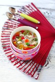 Куриную грудку нарезать небольшими кубиками. Лук порей и очищенный перец и морковь нарезать, чеснок через пресс, имбирь очистить и протереть на мелкой терке. Обжарить овощи на растительном масле...